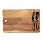 Set of an acacia wood cheese board (40 x 25 x 1.5 cm) and 2 stainless steel knives (20 x 2.5 cm, 19 x 3.5 cm). Delivered in a recycled cardboard gift box with magnetic closure. Acacia wood, Stainless Steel.