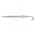 23" sateenvarjo, jossa on metallivarsi ja -ruoteet sekä puinen kahva.