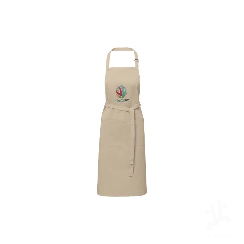 Suojaa kauniit vaatteet ruoanlaiton aikana helposti Andrea-esiliinalla. Esiliina on valmistettu 240 g/m²:n twill-sekoitteesta (65 % polyesteriä ja 35 % puuvillaa), mikä tekee siitä paksun ja tukevan mutta silti pehmeän ja mukavan käyttää. Kahdessa etutaskussa on helppo ja kätevä pitää keittiötarvikkeita. Esiliinaa voi säätää kaulan takana olevalla soljella ja selän solmittavalla kiinnityksellä, joten yksi koko sopii kaikille. Esiliinaan voidaan valita useita isoja painatusvaihtoehtoja ja varmistaa logon paras mahdollinen näkyvyys.