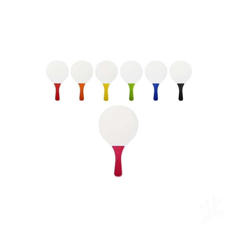 Rantapelisetti hauskanpitoon. Useita värivaihtoehtoja. Kestävä rantapelisetti on valmistettu MDF-puusta, kahva on värillistä PP-muovia. Mukana samanvärinen pehmeä pallo verkkopussissa, joka helpottaa kuljetusta rannalle hauskanpitoa varten. Varoitus! Ei sovellu alle kolmivuotiaille lapsille. Pienet pallot. Tukehtumisvaara.