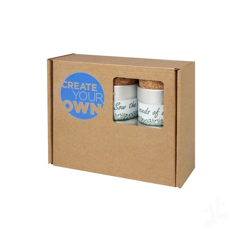 This desktop garden set, contains three grow-pots made from recycled brushed aluminium. It includes innovative seedballs that will germinate in 1-2 weeks, containing a herb mix (chives, sweet basil, parsley, dill and sweet marjoram). Each pot includes a cork stopper, growing instructions and organic soil coins. Once your plants have grown, you can re-use the pots to grow again, use for storage or recycle them. Supplied in a gift box which can be printed. Made in Europe.