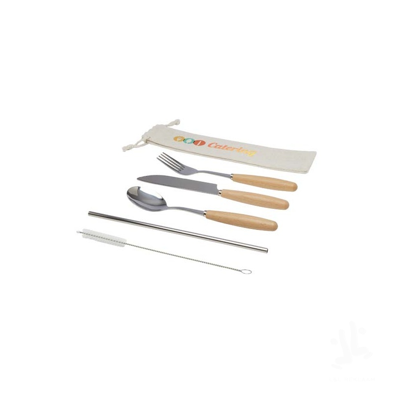 Root ruokailuvälinesarja sisältää haarukan, veitsen, lusikan, pillin ja puhdistusharjan. Aterimet on valmistettu ruostumattomasta teräksestä, joka on kestävää ja helppoa puhdistaa, ja kahvat on valmistettu pyökkipuusta. Toimitetaan puuvillapussissa.