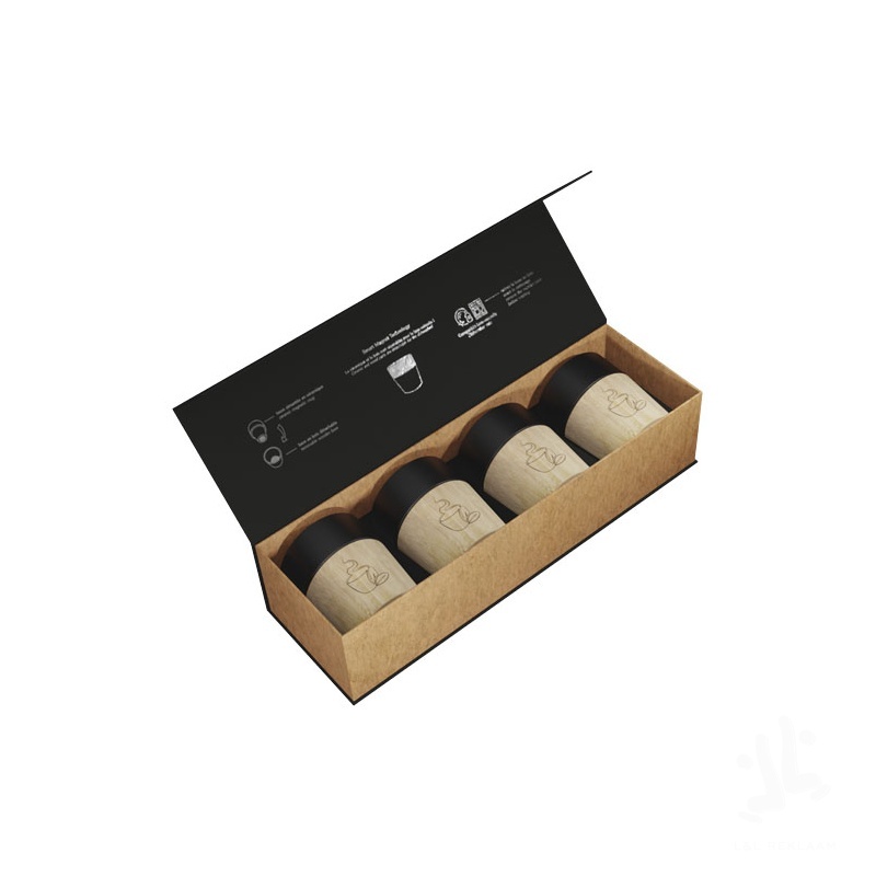 Neljä kappaletta 150 ml:n keraamisia mukeja magneettisella puupohjalla, ihanteellinen espressoille tai espresso lungoille. Älykkään magneettiteknologian ansiosta puupohja voidaan irrottaa keraamisesta mukista helppoa puhdistamista varten. Keraamiset mukit voi pestä astianpesukoneessa. Toimitetaan kierrätetystä voimapaperista valmistetussa lahjapakkauksessa, jossa on magneettinen suljin (34,5 x 12 x 9,5 cm). Laserkaiverrus on luontoa säästävä painatusvaihtoehto puupohjalle.