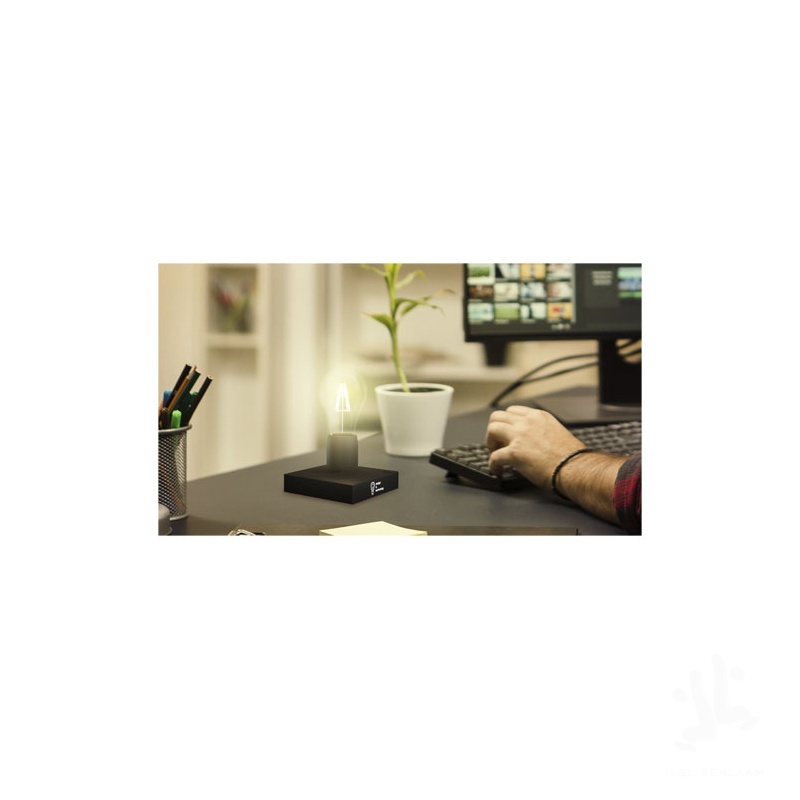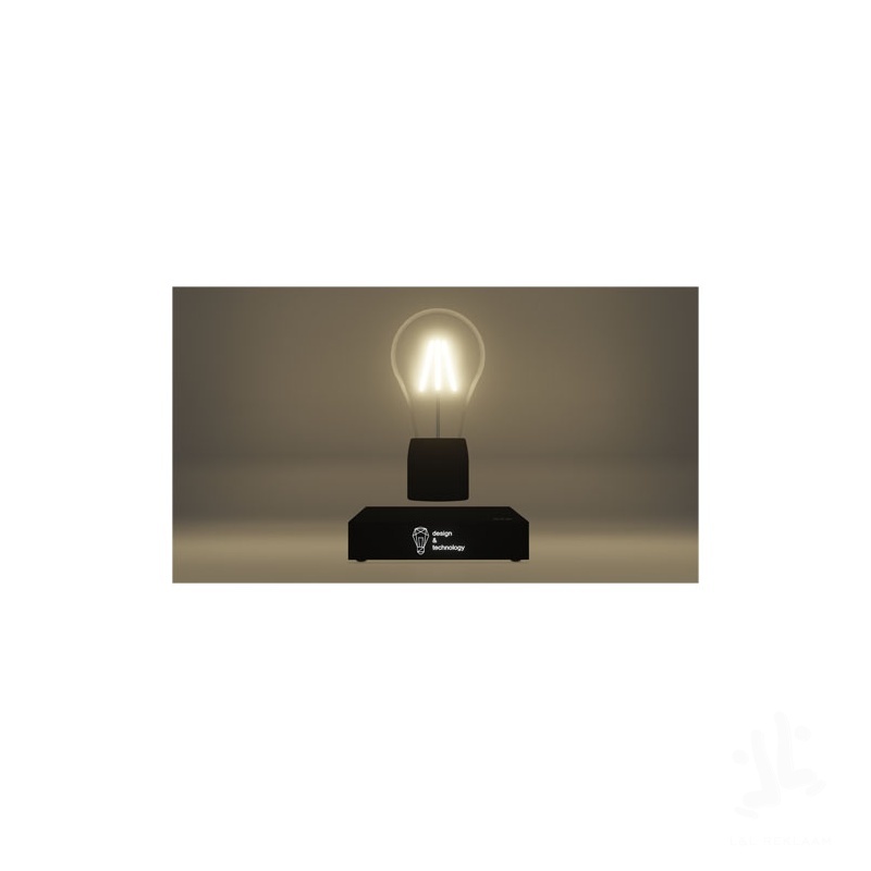 Tyylikäs levitoiva lamppu, joka näyttää hyvältä jokaisella pöydällä. Valaisimessa on sileä kumialusta, johon voi lisätä yksilöllisen valaistuvan logon. Tehokas magneettiteknologia kannattelee hehkulamppua levitoimassa alustalla. Hehkulampun voi sytyttää ja sammuttaa valaisimen alustassa olevalla kosketuspainikkeella. Enimmäisteho: 130 lumenia. Valaisimen mitat ovat 12 x 12 x 16 cm, ja se on pakattu mustaan lahjapakkaukseen, jossa on magneettinen suljin (18,5 x 13 x 13 cm). Sisältää kolmen vuoden takuun.