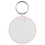 Valkoinen ympyränmuotoinen avaimenperä, jossa on metallinen avainrengas. Metallirengas tekee profiilista litteän, mikä on ihanteellista postituksen kannalta.