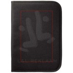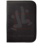 Kansiossa on vetoketju, kynälenkki, asiakirjataskut ja 20 viivoitettua muistipaperia. Kynä ja tarvikkeet rekvisiittaa.